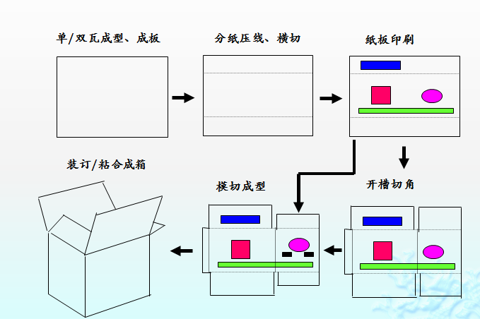 一、瓦楞紙箱的基本生產流程: