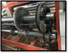 ●利用壓線輪、輪轉開槽刀、切角刀,在紙板上形成所需的翻折槽及舌頭。